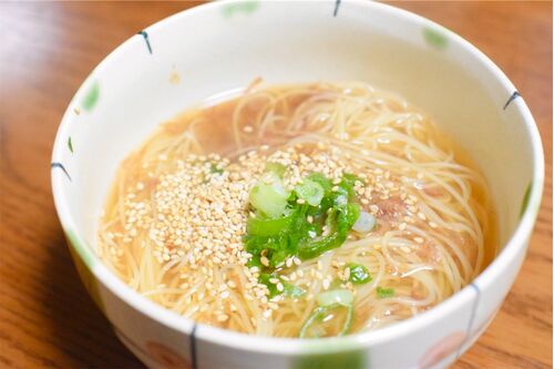 リュウジさんが素麺で作った「無限塩油そうめん」をカペッリーニのパスタで作ったもの。白だしと胡麻油がポイント。胡麻油は香ばしさとコクを加え、白だしは昆布や鰹節の旨味が凝縮された和風のベースであり、フュージョンすると、あっさりしながらも奥行き…