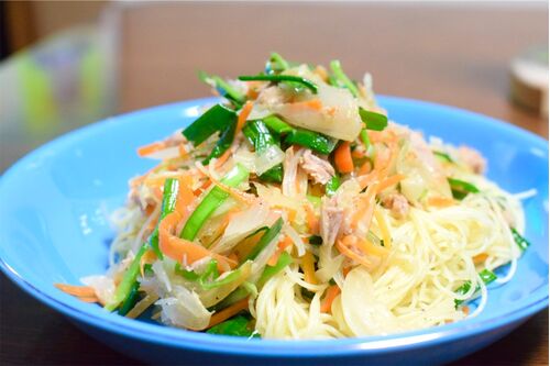 沖縄で年中食べるそうめん料理をパスタにアレンジ。ツナと白だしの旨味が絡む、爆速チャンプルースパゲティ。「チャンプルー」は沖縄の言葉で“混ぜ合わせる”。野菜とツナの旨味、白だしのまろやかさが絡むと、気づいたら皿が空っぽになる魔性の一皿が完成す…